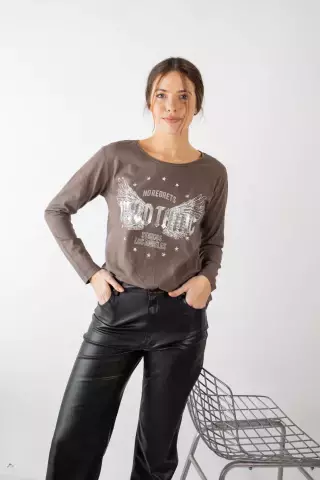 El escote redondo aporta un toque clásico y versátil, mientras que la estampa única añade un elemento distintivo a tu look diario. Perfecta para lucir en cualquier ocasión, esta remera combina a la perfección con tus jeans favoritos o una falda elegante.